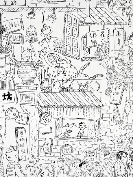 In the dense inner rhythm of Shanghai, you turn into a narrow lane in Tianzifang — one of those little streets where shop signs, tangled cables, and the occasional too-curious tourist all seem to overlap. And then suddenly, you see it. A wall that doesn’t just depict the city — it behaves like it. A drawing of a folded metropolis where everything happens at once: human, animal, myth, food, labour, signage, watching and being watched. It speaks in continuous sentences, without pause or hierarchy.