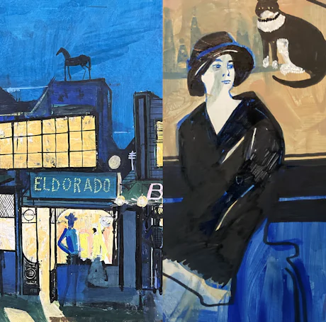 Dos bares, dos mundos. El diseño escenográfico de Eldorado de Valery Levental brilla con vida, su caballo en la azotea vigilando las animadas veladas. Mientras tanto, en un pub de Amberes, una puerta pintada captura un momento tranquilo: una mujer vestida de negro, su mirada distante, un gato observando desde el fondo. Lugares separados, pero sus historias se entrelazan de manera intrigante.