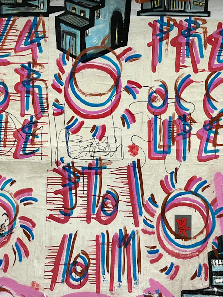 A primera vista, se lee como un alfabeto olvidado — parte código, parte ritual, parte onda sonora congelada sobre papel y pegada en la calle. ¿Es un idioma a la espera de ser descifrado? ¿Una escritura sin gramática? Los círculos repetidos laten como pulsos, los colores duplicados vibran como un eco visual.