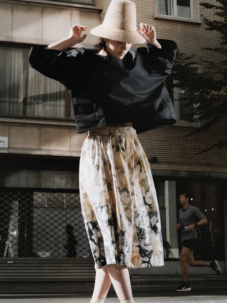 Vista desde la calle, esta pared se lee primero como un paisaje apacible: colinas redondeadas bajo un cielo azul amplio y suave, algunos pájaros deslizándose en el aire. Al mirar de nuevo, el suelo bajo ellos se transforma. Estas colinas no están hechas de tierra ni de piedra, sino enteramente de flores — pétalo a pétalo, la repetición convirtiéndose en volumen.