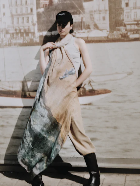 Ici, la ville est volontairement désaturée. L’argile, la craie et les verts adoucis s’installent dans un paysage qui semble davantage remémoré qu’observé — fragment de souvenir, rêve architectural. Dans l’immense étendue brune, elle est trop petite pour l’espace. Elle ne court pas, ne pose pas, ne se retourne pas. Elle marche, simplement. Sànbù — marcher sans but, le mouvement comme contemplation. Les bâtiments gardent leurs distances, les arbres suspendent leur poids, et le temps semble desserrer son emprise. À Shanghai, pas de slogans, pas de graffiti qui crie ou juge. Juste un rappel discret de la vie ordinaire — d’hier à aujourd’hui.