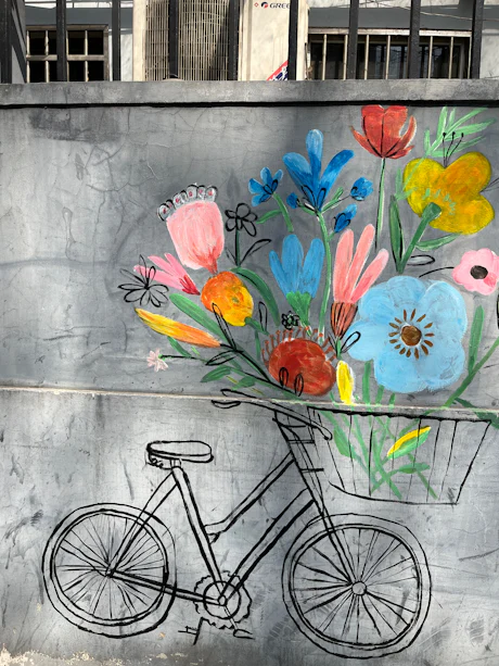 Nel grigio silenzioso dei muri operai di Shanghai, nelle strade dense e vibranti dell’ex Concessione Francese, questo murale era quasi invisibile — nascosto dietro mille auto parcheggiate e un milione di biciclette mute. Ma una volta trovato, era impossibile dimenticarlo. Bouquet Express. Una bicicletta disegnata nella sua pura funzione, che trasporta un carico che rifiuta ogni contenimento. Dal cestino i fiori esplodono in avanti — giallo, blu, rosso, rosa — sfidando la calma del cemento. Una consegna senza motore, senza rumore, senza indirizzo. Solo colore, che arriva senza annunciarsi.