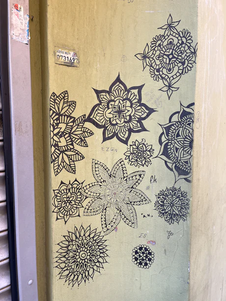 Su una parete giallo spento a Istanbul, intricati motivi neri a forma di mandala si aprono come delicati fiori urbani. Ogni disegno, curato nei minimi dettagli, regala un momento di calma in contrasto con il trambusto circostante. Che si tratti di un’espressione artistica passeggera o di un piccolo atto di ribellione, queste forme simmetriche donano un’eleganza silenziosa a un angolo della città logoro e discreto.