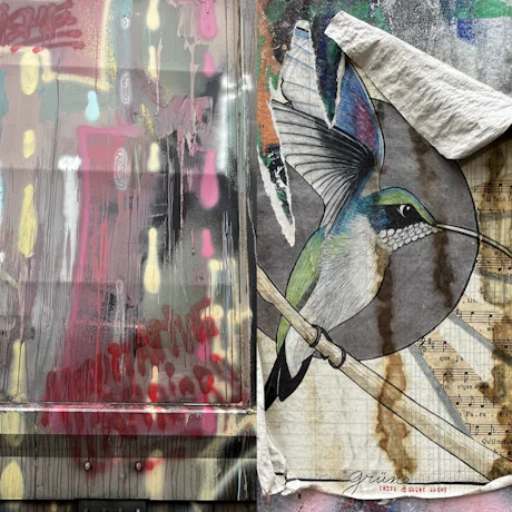 Graffiti scorrono su un telone di un vagone nel porto di Anversa, una miscela caotica di colori sgocciolanti in contrasto con lo sfondo industriale. Intanto, un colibrì dipinto su spartiti musicali d’epoca nella casa di Gainsbourg in Rue de Verneuil a Parigi richiama “Melody Nelson.” Questi murales vivaci, che uniscono grinta urbana e arte delicata, celebrano la bellezza effimera e il fascino eterno della musica in movimento.