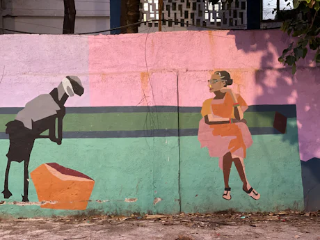 Solo per occhi attenti: un murale con audaci forme geometriche nei toni caldi del pesca, rosa, ocra e verde rivela una donna elegante, assorta nei suoi pensieri sotto il sole.