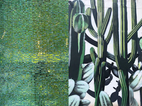 A Calcutta, una piccola superficie rotonda scintilla come acqua che si rifiuta di muoversi, minuscoli frammenti di vetro catturano la luce finché un tavolo diventa miraggio. A Siviglia, un muro si riempie di cactus, verdi sovrapposti che salgono con un ritmo verticale affilato, una presenza costruita dalla ripetizione e dai margini. Due opere, due modi di superficie. Una si dissolve nel riflesso; l’altra si afferma nella forma. Illusione da un lato, resistenza dall’altro.