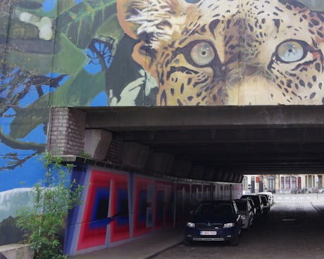 一幅醒目的壁画描绘了一只豹的眼睛,装点着安特卫普市一座城市桥梁。画面背景是蓝绿叶片,为工业氛围的城市增添了自然气息。桥下的通道涂满涂鸦,停着车辆,与上方充满热带丛林气息的画面形成鲜明对比。